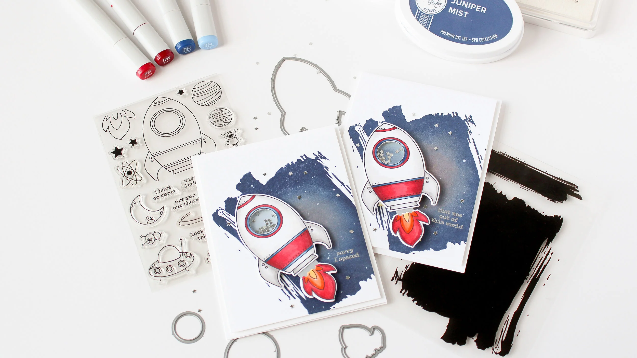 Today I’m sharing a card with a clean and simple galaxy background. I’ve also created a shaker element featuring the brand new Space Out stamp set from the September Essentials By Ellen release. I love the bold space background for this adorable space ship.