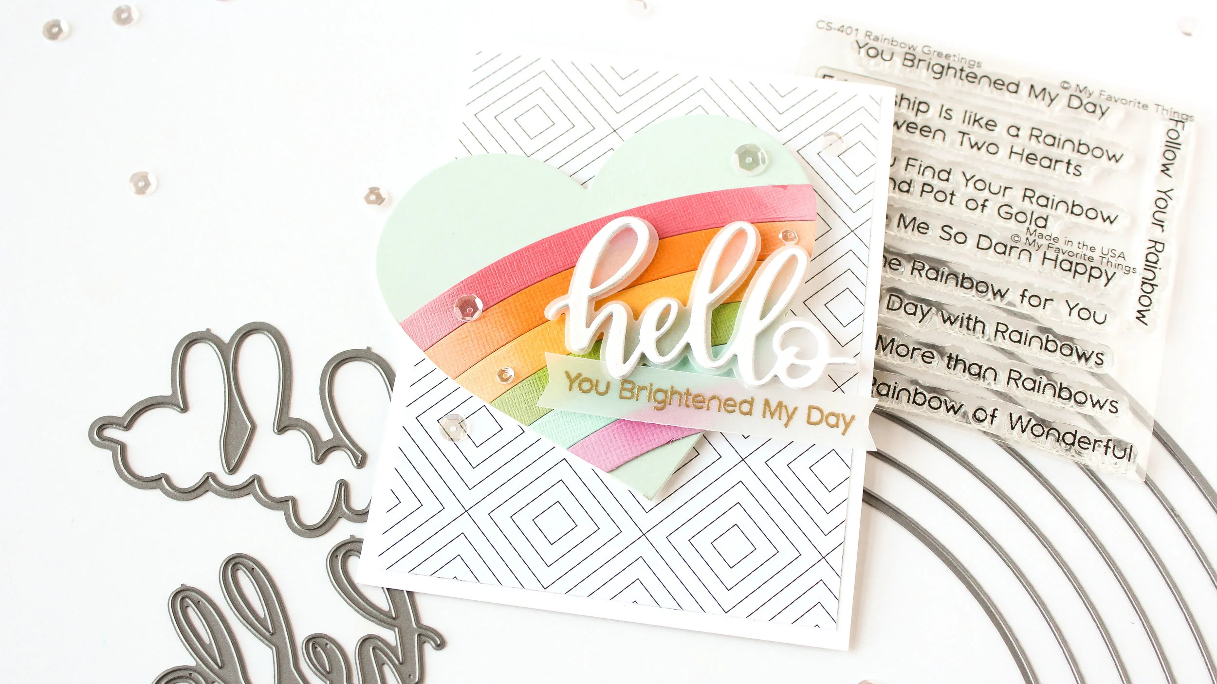 I’ll be using the My Favorite Things Rainbow Bright die to create a fun rainbow on my die cut. I’ve die cut it several times from different colors of textured card stock. I love the extra little somethin-somethin that textured card stock adds to simple cards and die cuts.